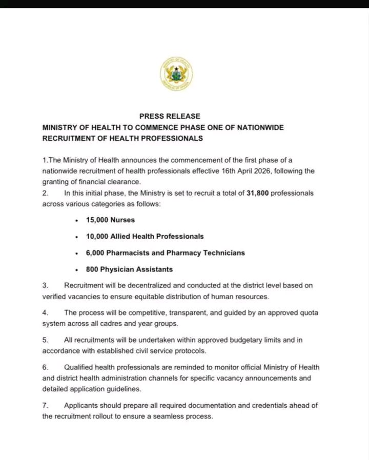 With the timeline now clearly outlined, prospective applicants are expected to act promptly and follow all guidelines to ensure a smooth application process. The success of this recruitment exercise will not only benefit job seekers but also contribute to improving healthcare delivery across Ghana.